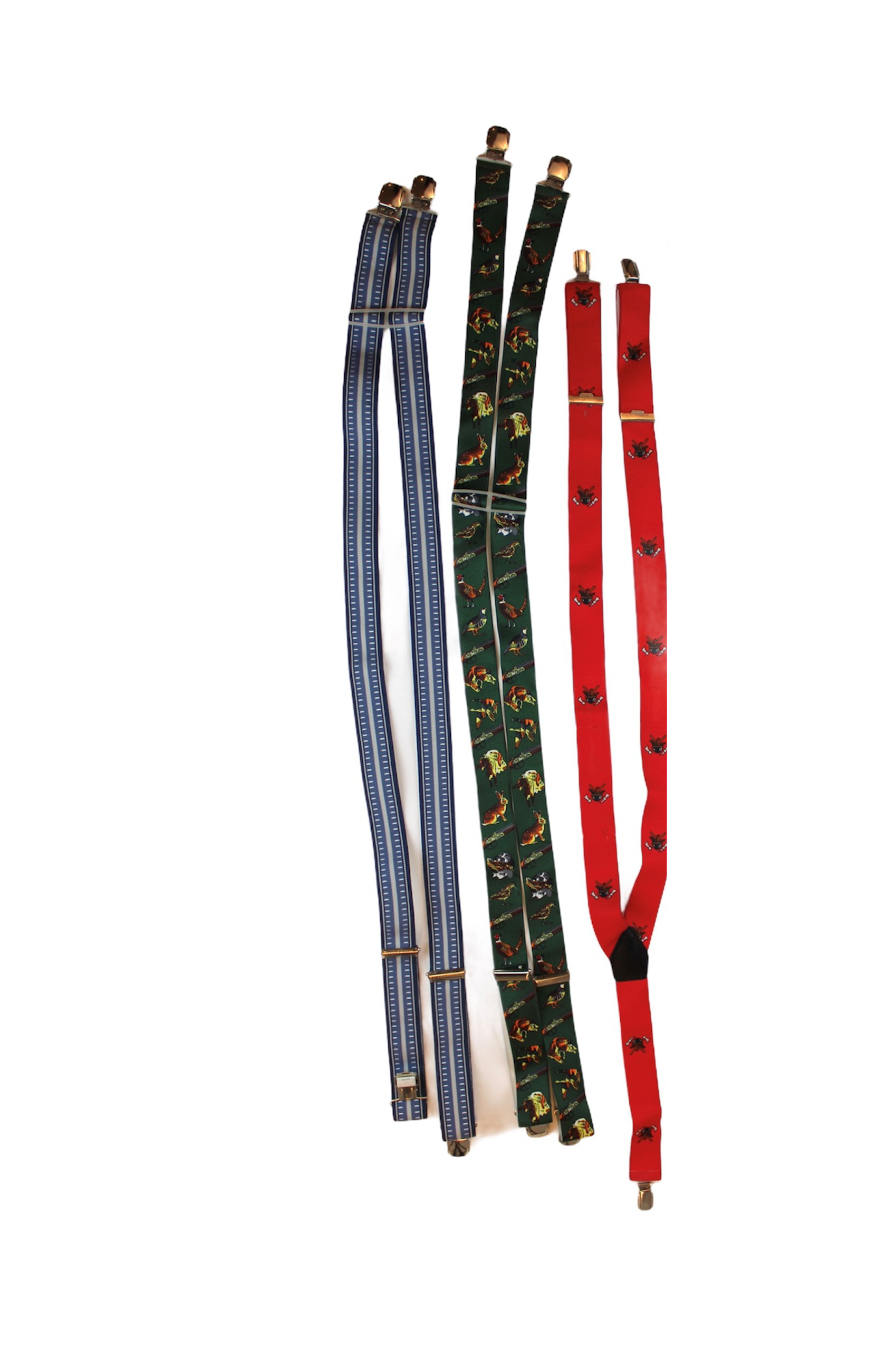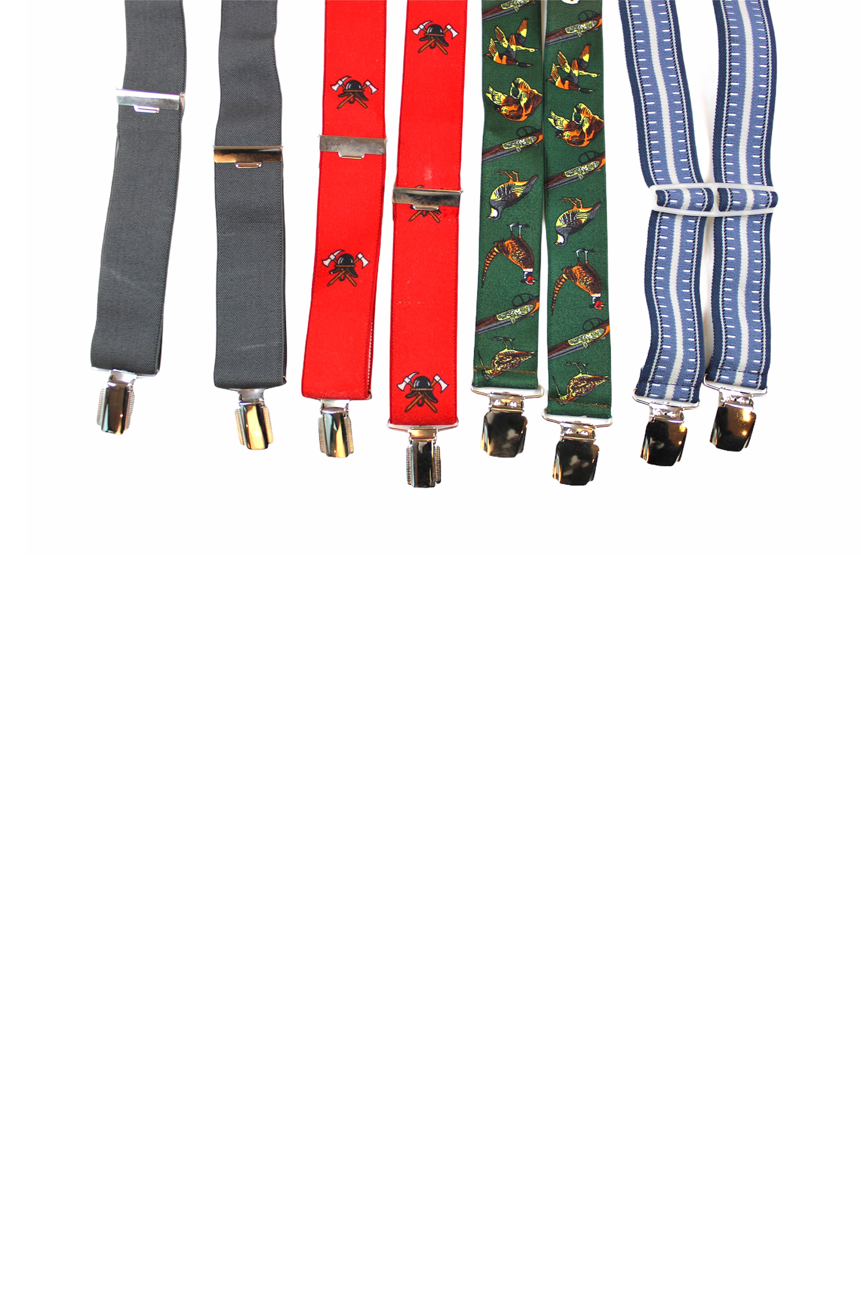 a pair of elastic straps that go over the shoulders and are fastened to the pants, to keep the pants up, could be plain of color or printed