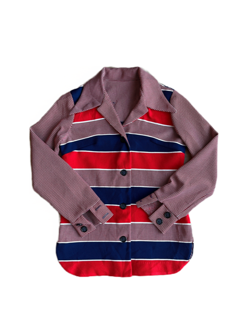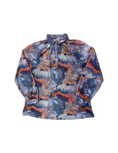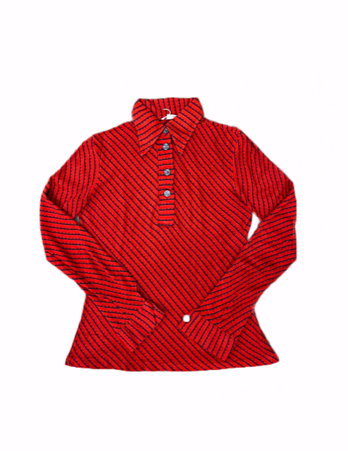 unbranded- slim fitting blouse- often with big collar or long bow tie- usually thin polyester- hand finished hem, high quality plastic buttons