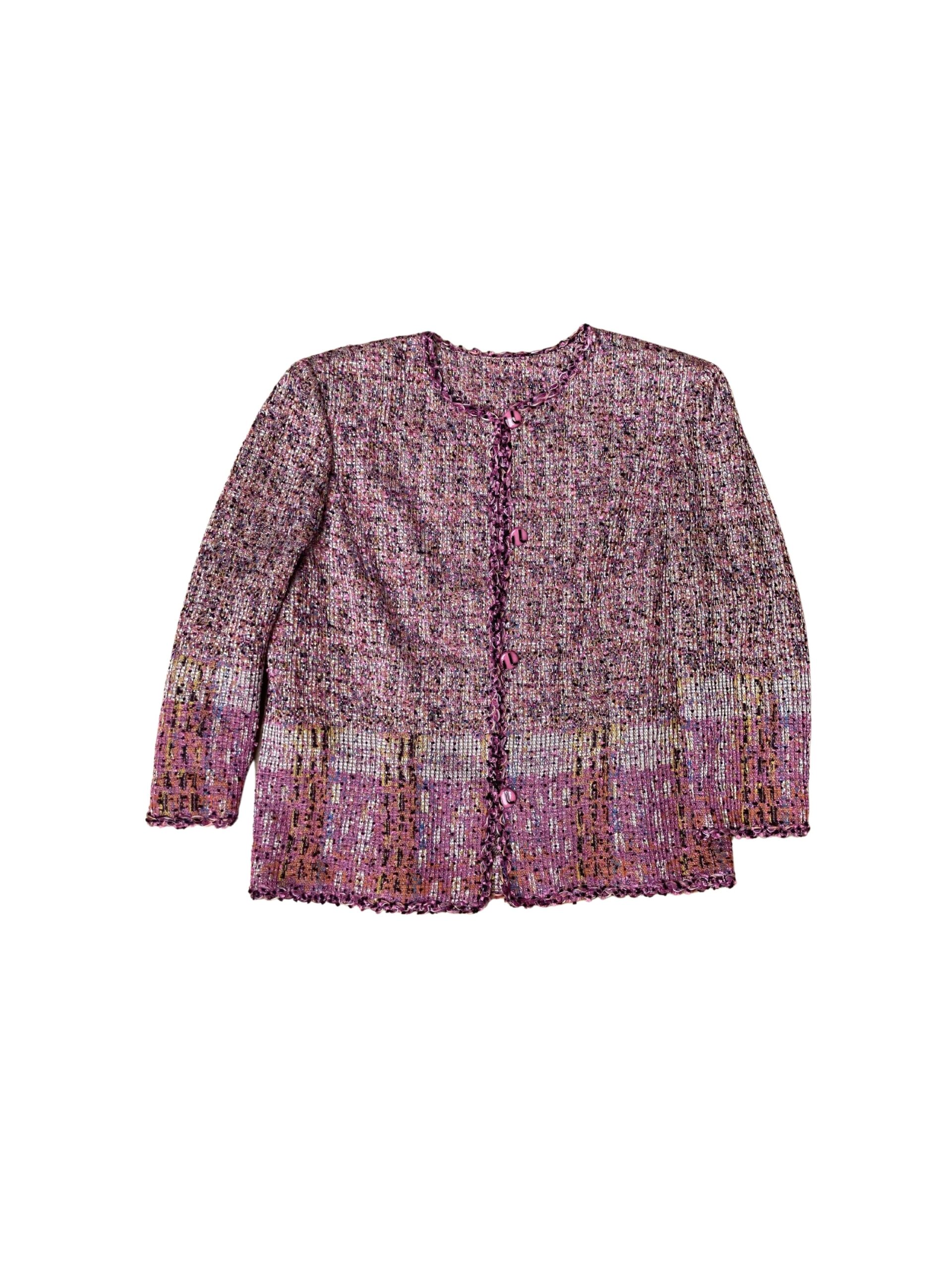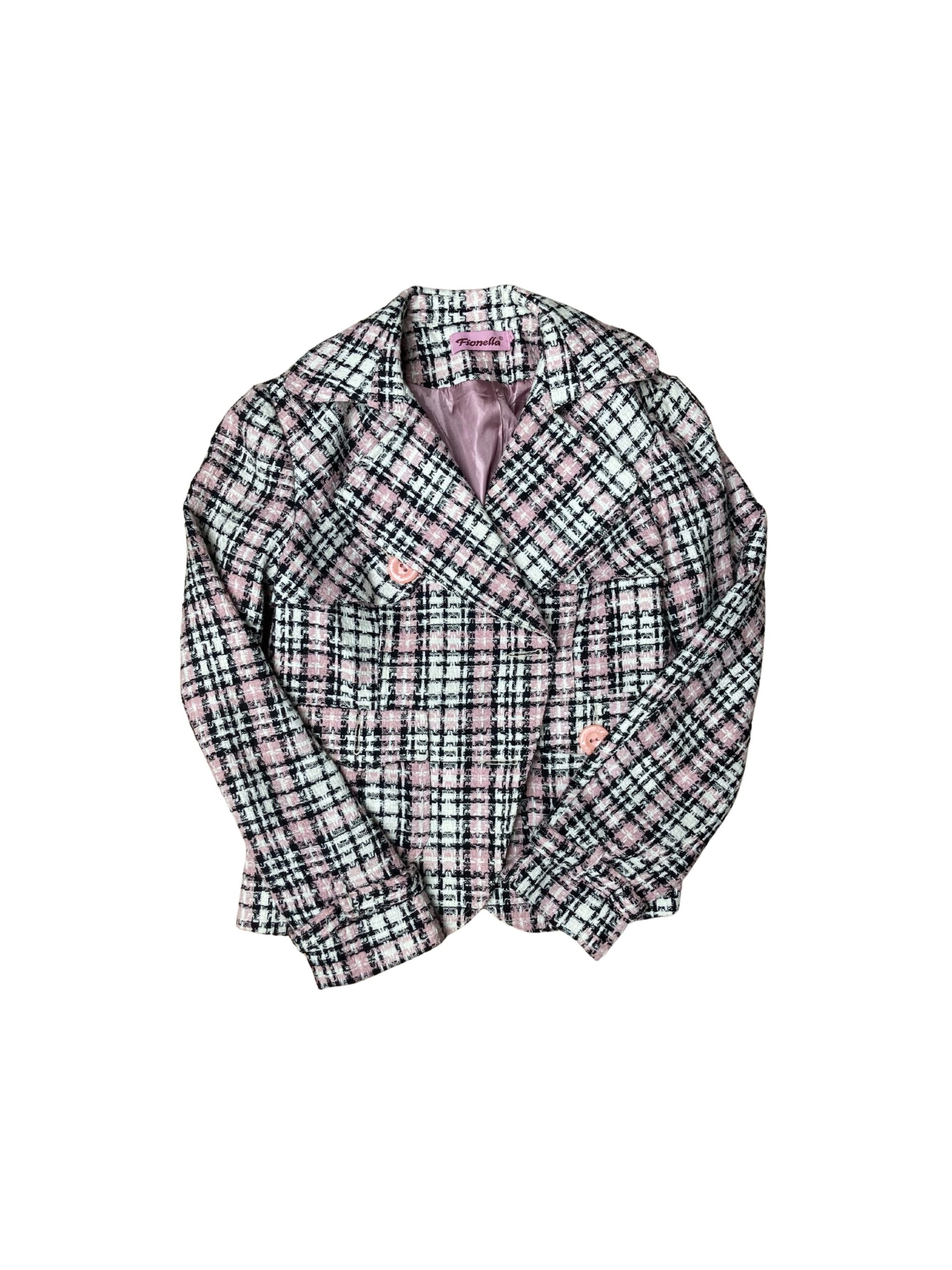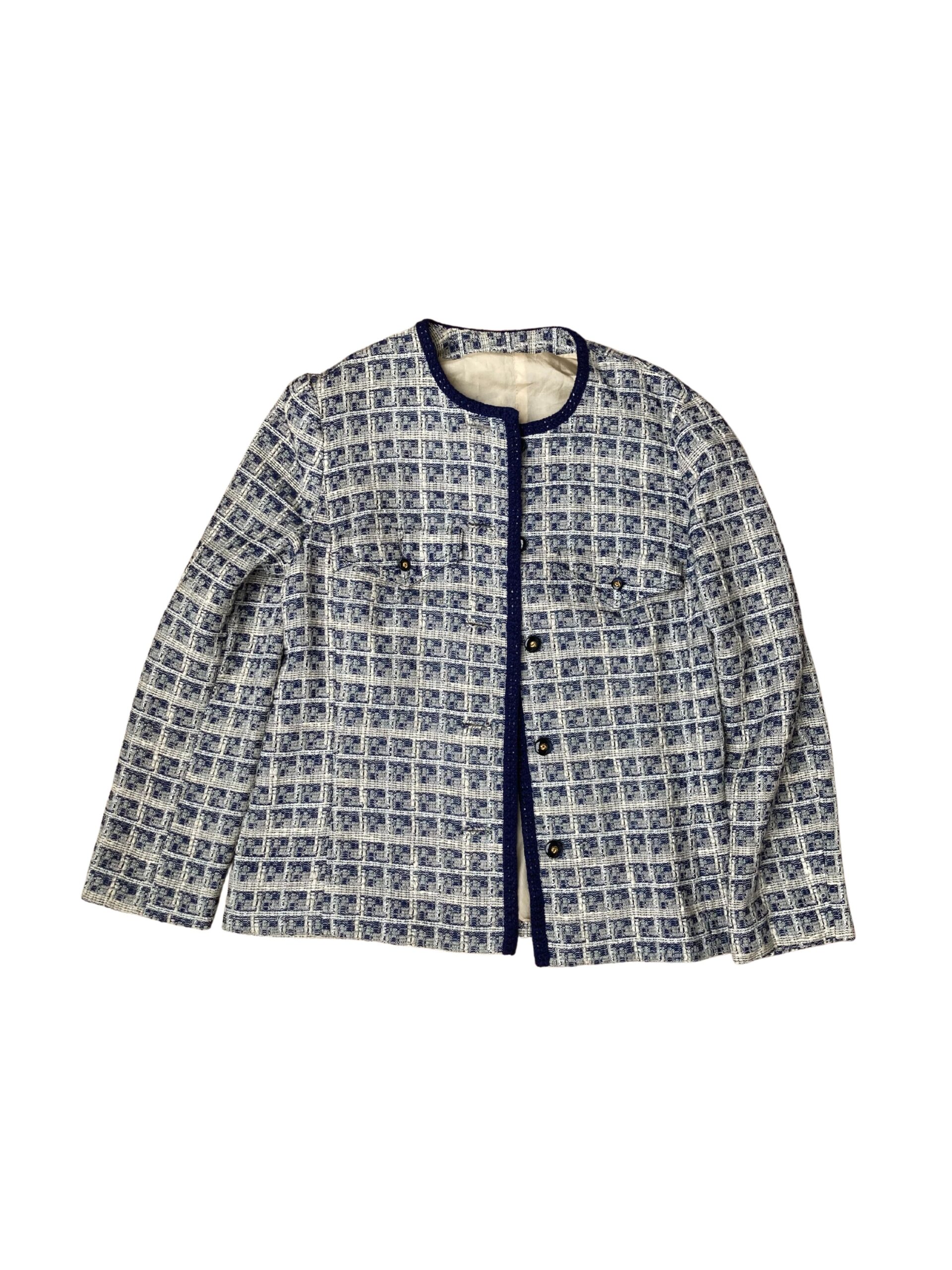 unbranded- blazer that closes on left side – thick material with lining usually, short model that remind of the chanel boucle fabric / buckled tweeddesign, patterned, wothout collar oftenly, closes with buttons