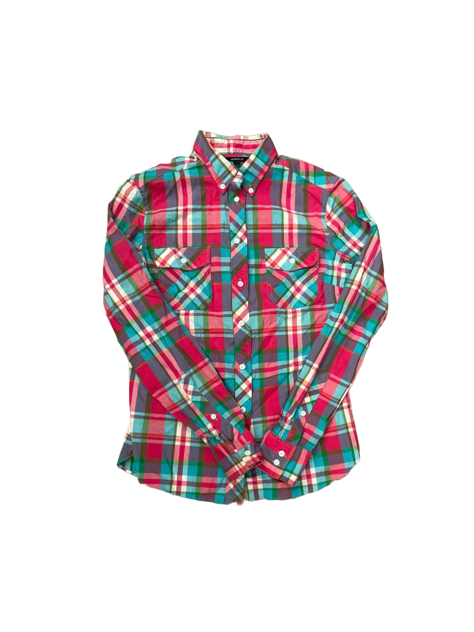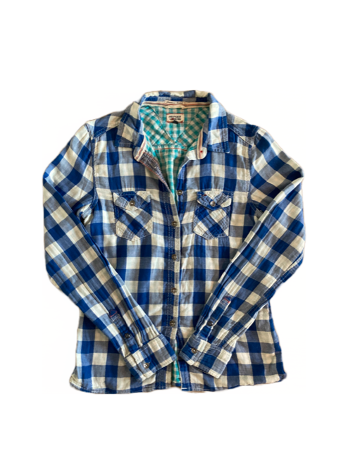 button down lady blouse made out of thick materials like wool or acrylic, branded. Brands like Calvin Klein, Lee,