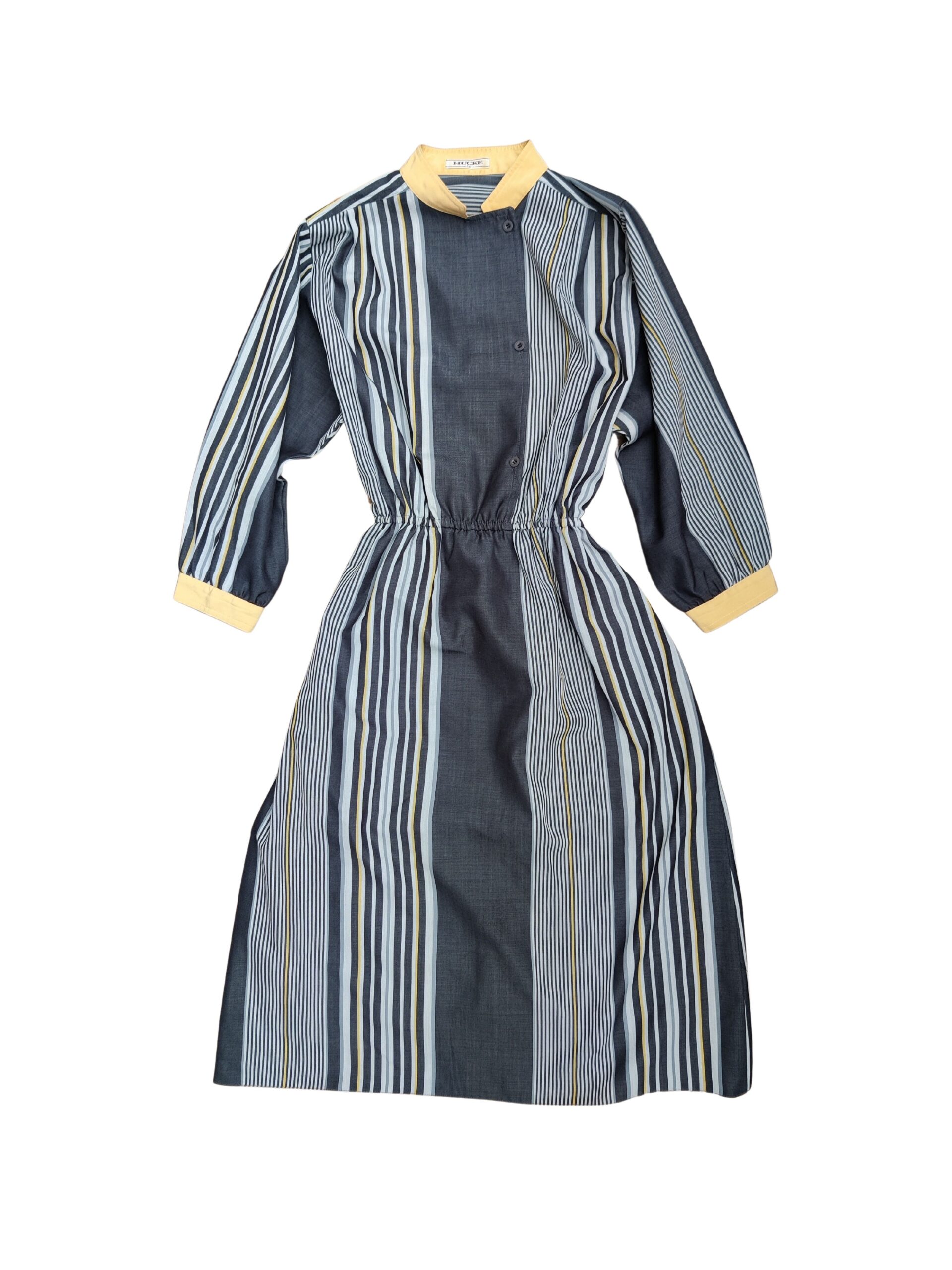 polyester mostly printed sometimes plain dresses, with shoulder pads and an elastic waist and long sleeves