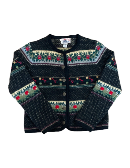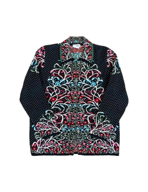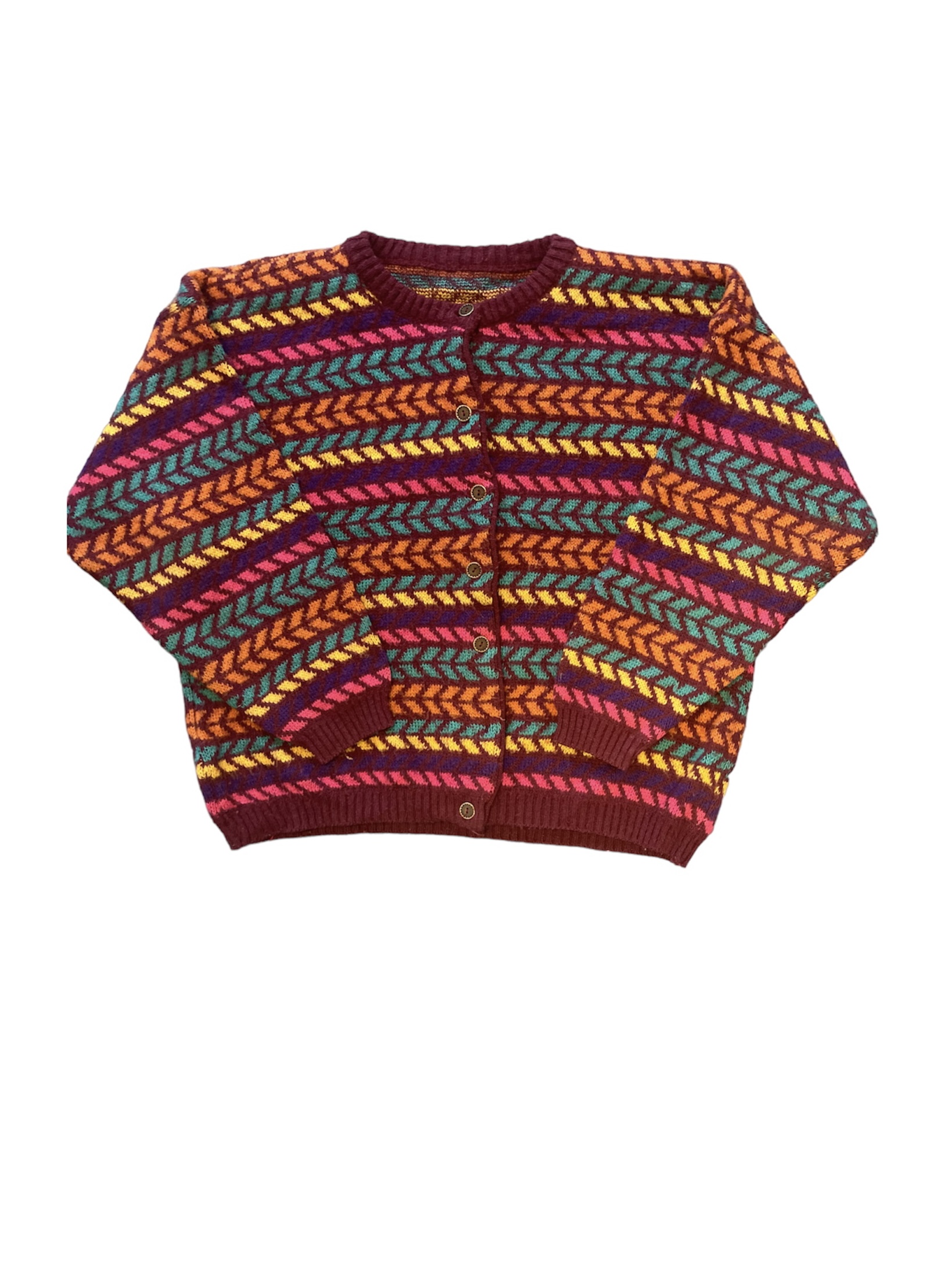 cardigan for ladies, closes with buttons on the left side, is prinetd, patterned, colorful