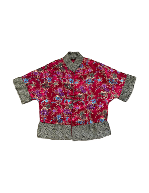 shiny/satin look tops (shirts and jackets) – overall print moslty gold thread- with depictions of dragons / flowers, bamboo – often smaller sizes – usually women’s e.g. dresses with fabric toggles